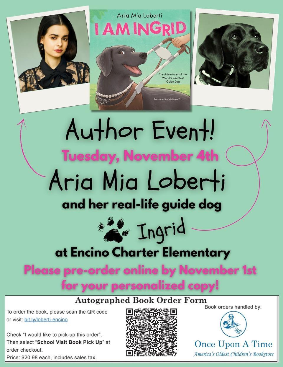 Author Visit: Aria Mia Loberti & Ingrid the Guide Dog! - Tuesday, November 4th: We’re excited to share that students in Grades K–3 will enjoy a special Author Event on Tuesday, November 4th with Aria Mia Loberti, author of I Am Ingrid: The Adventures of the World’s Greatest Guide Dog, and her real-life guide dog, Ingrid! Families may pre-order an autographed book through our partner bookstore, Once Upon a Time. To receive a personalized copy, please place your order by November 1st using this link: bit.ly/loberti-encino Be sure to select “School Visit Book Pick Up” at checkout. This inspiring visit celebrates kindness, inclusion, and courage—we can’t wait for our youngest Explorers to meet Aria and Ingrid! 🐾
