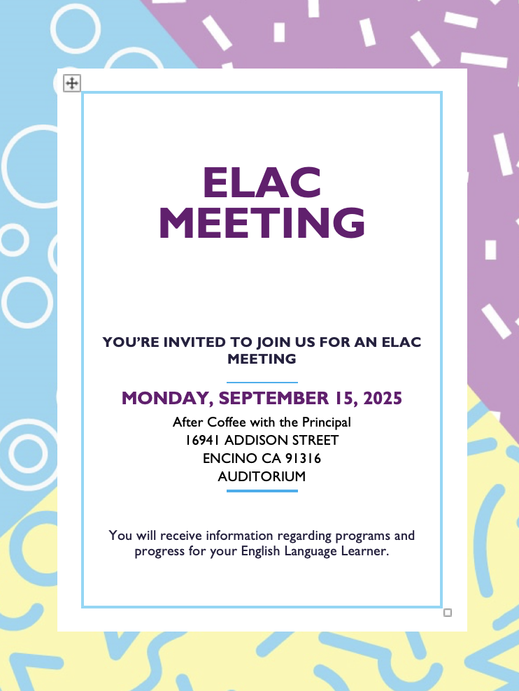 Encino Charter’s English Learner Advisory Committee (ELAC) meets regularly throughout the year to support the success of our English Learner students. Meetings focus on important topics such as attendance, assessment data, and academic strategies that families can use at home to support learning.