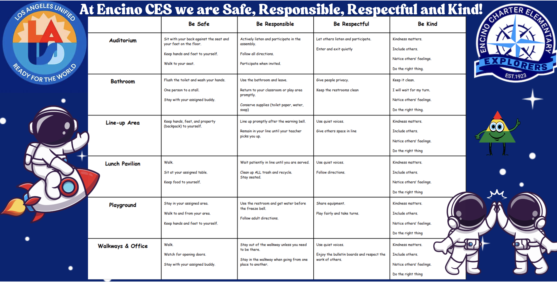 At Encino Charter, we are committed to every student receiving an equitable education where they develop confidence in learning and in themselves. With Social Emotional Learning at our core, our students thrive in an inclusive environment where their individual needs are met, essential social and leadership skills are developed, and classes deepen their classroom learning. Through restorative practices and positive behavior management, every student is respected and is treated with kindness.At Encino Charter Elementary we follow four school rules: